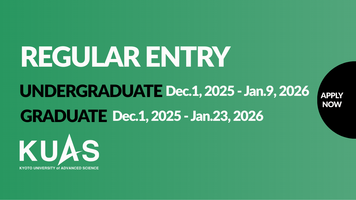 Kyoto University of Advanced Science (KUAS) is pleased to announce the opening of applications for our Regular Entry application period for the September 2026 enrollment. Applications are available for our all-English international faculties in Engineering, Bioenvironmental Sciences, and Economics and Business Administration, as well as our graduate programs in Engineering.