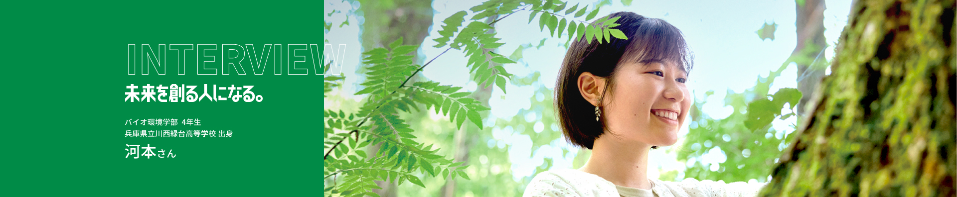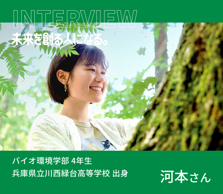 私の夢は、樹木医として地域の自然を守り、人々の温かなつながりを支えることです。学内の「バイオ環境園」では、友人と自然散策をしたり、航空写真を使って植生を分類したり、タケノコ掘りなどのフィールドワークに励んでいます。学校生活以外でも、山に出かけて気になった植物を同定しています。環境教育を通じて子どもたちとふれあいたいという思いから、トレッキングやキャンプなどの引率ボランティアにも参加したいと考えています。KUASの恵まれた環境を活かして学びを深めた結果、東海地方の造園土木会社に内定が決まり、夢の第一歩を踏み出すことができました。「これからも自然を学びながら、一人でも多くの人に自然や環境の大切さを伝えたい」――そんな想いを胸に、樹木医を目指して努力を続けていきたいです。