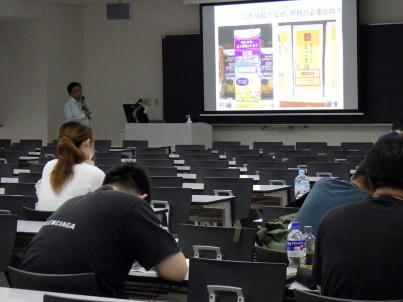 続いて、先生のご専門である脂質について、油との違いや、これに含まれる脂肪酸の種類など詳細にご説明いただきました。魚由来の機能性脂質であるEPAやDHAについては、中性脂肪低下作用に加えて、視覚機能や記憶力向上にも効果があるとのことでした。