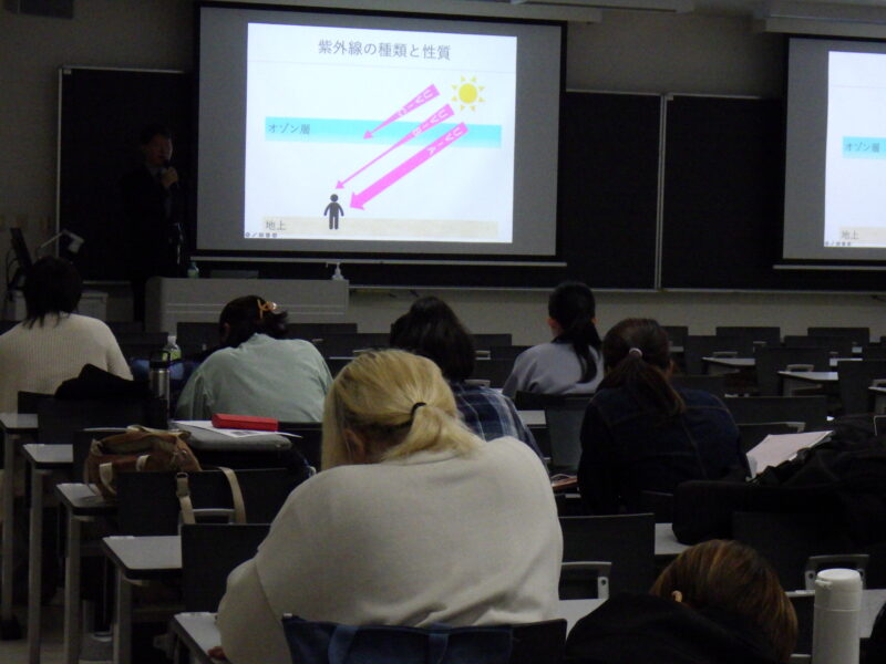 また、皮膚の持つバリア機能について、普段学ぶことのできない皮膚化学的な観点からお話いただきました。その後、紫外線の成分であるUV-AとUV-Bの違いや、これらによる皮膚への影響、またこれを守るための指標であるSPFやPAの持つ意味についての説明もあり、日焼けを防ぐための成分の違いや、効果的なシミやソバカスの原因ともなる紫外線対策の重要性について教えていただくなど、日常生活にも大変参考になる内容でした。