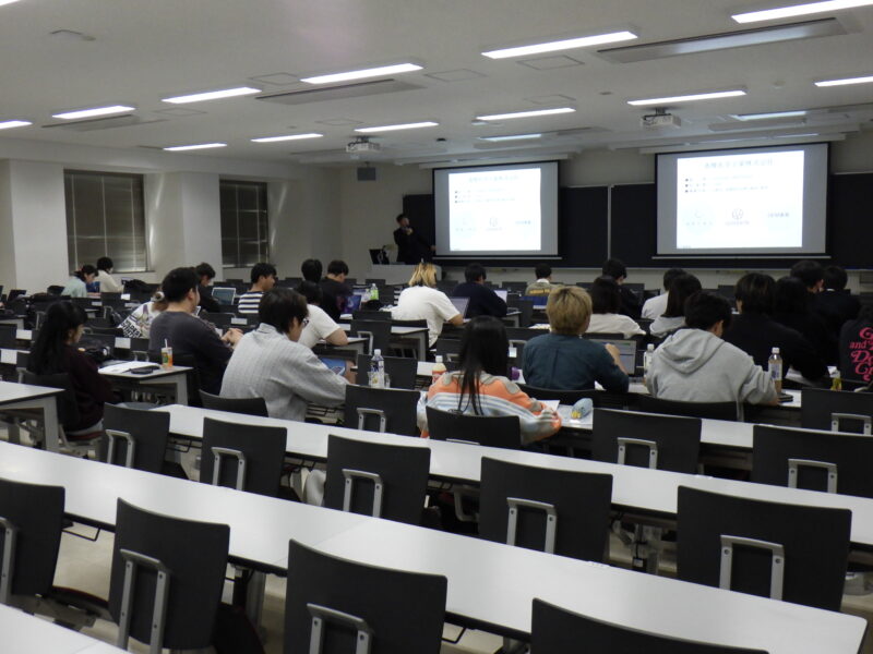 「バイオテクノロジー産業の最前線」は、バイオ環境学部の2年生以上が対象の科目です。社会に出てからのキャリアアップを目的に、15回にわたってオムニバス形式で開講しています。産業界(食品、化粧品、医薬品、等)あるいは研究機関の第一線でご活躍されている方を講師にお招きし、講演いただいています。