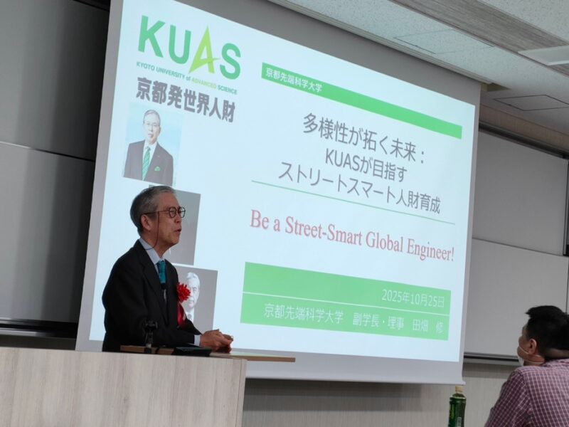 10月25日に、日本機械学会関西支部が主催する秋季技術交流フォーラムが本学太秦キャンパスで開催されました。今回で26回目となるこのフォーラムでは、参加者が6つの懇話会に別れ、それぞれのパラレルセッションで、基調講演と活発な議論がなされました。また、参加者全員が聴講する特別講演では,本学副学長の田畑教授が、「多様性が拓く未来:KUASが目指すストリートスマート人材育成」と題して講演を行いました。本学からは他にも数名の工学部教員と工学研究科の大学院生が会場係としてフォーラムをサポートしました。