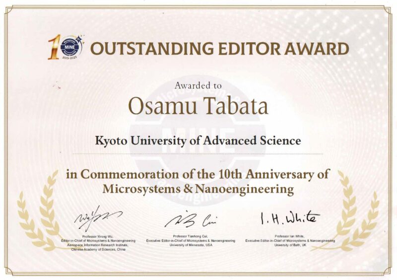 Microsystems & Nanoengineering(マイクロシステムとナノエンジニアリング)誌は、 Springer Natureと中国科学院の共同で刊行されるオンライン限定のオープンアクセスの国際誌です。マイクロ・ナノスケールのMEMS/NEMSに関する設計、製造、応用、物性評価など、基礎から応用まで幅広い研究成果を掲載し、学術誌として非常に高い評価を得ています。 今回、講演者として招かれた田畑副学長は、受賞式の後、 Microfluidic-Assisted Assembly of Fluorescent Nanodiamonds for Temperature Mapping of Organoid on MPS ( MPS上オルガノイドの温度マッピングのための蛍光ナノダイヤモンドのマイクロ流体援用アセンブリ)というテーマで講演を行いました。
