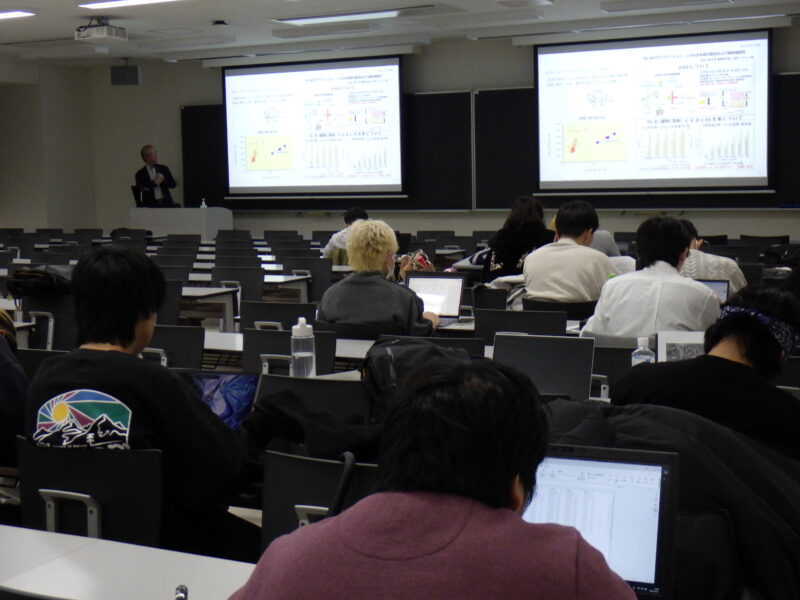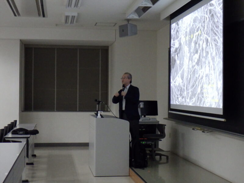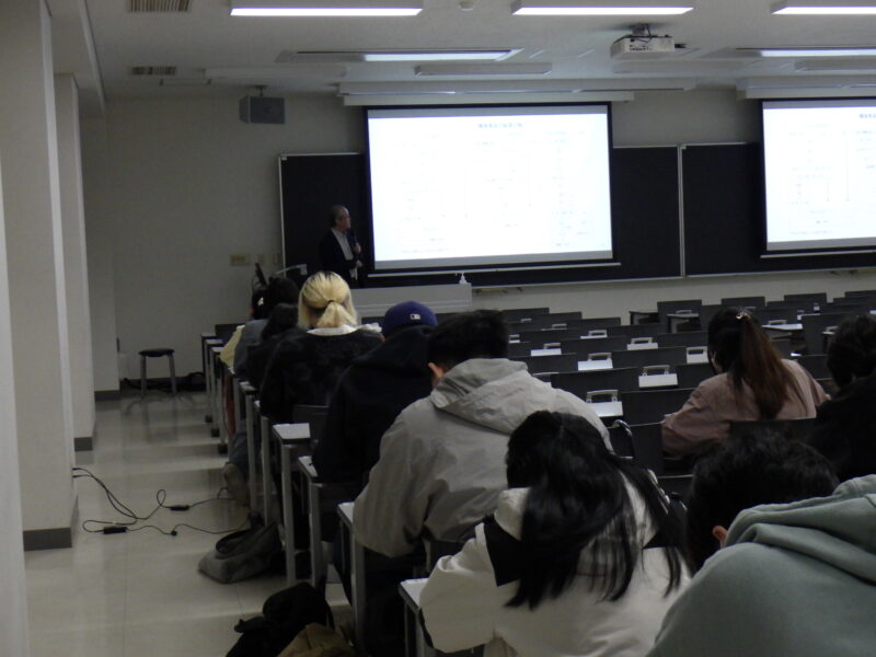 「バイオテクノロジー産業の最前線」は、バイオ環境学部の2年生以上が対象の科目です。社会に出てからのキャリアアップを目的に、15回にわたってオムニバス形式で開講しています。産業界(食品、化粧品、医薬品、等)あるいは研究機関の第一線でご活躍されている方を講師にお招きし、講演いただいています。