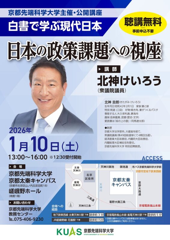 2026年1月10日(土)午後1時より、本学経済経営学部特別公開講演会として、衆議院議員兼本学特別招聘客員教授の北神けいろう氏をお招きし、「日本の政策課題への視座」のタイトルで公開講演会を開催致します。