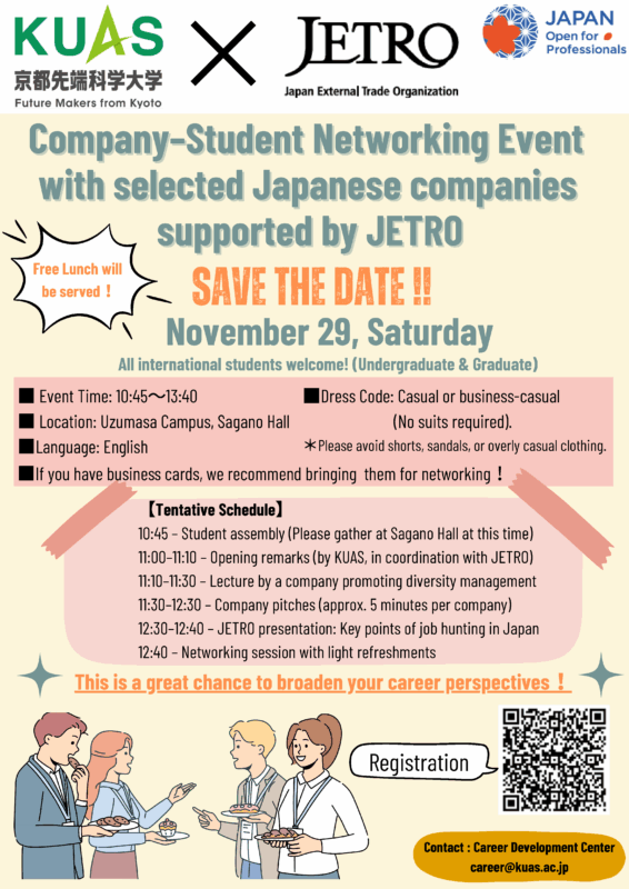 本学とJETRO(日本貿易振興機構)との共催により、留学生の採用に積極的な日本企業と本学英語基準留学生との交流会を開催します。