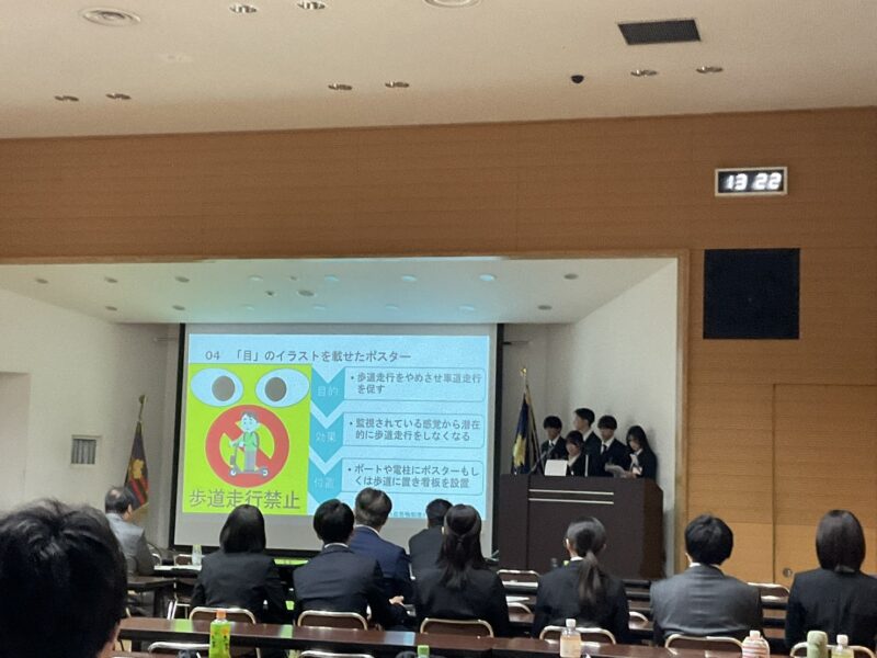 2024年12月に実施された京都府警察交通企画課主催の、大学ゼミ対抗プロジェクト「ポリス&カレッジ in KYOTO」でのテーマは、「モビリティシェアリングにおける交通安全に向けた取組」でした。これに対して、本学の経済経営学部生のアイデアは、レンタル・サイクルや電動キックボードなどの利用者に「原則歩道通行禁止」等の交通ルールを遵守してもらうために、行動経済学の知見を活かした企画を提案しました。その一環として啓蒙ポスターに「目」の絵を入れることで、利用者の内面に見張られている感覚を生み出し、ルール遵守の行動を促そうとするアイデアが評価され、この度最優秀賞を受賞することができました。