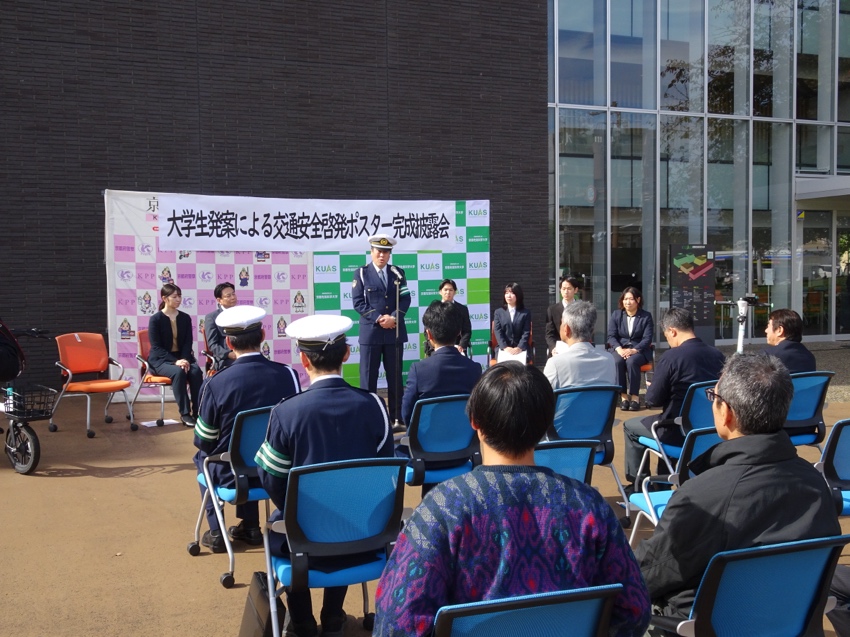 ポスター披露会の冒頭では、今回のプロジェクトの主催者であり、企画案の実現に向けてご尽力いただいた京都府警察本部の奥野交通部長様よりご挨拶と学生への評価のお言葉をいただきました。次いで、本学副学長兼経済経営学部長 徳賀芳弘学より、本学学生のアイデアの実現にご協力いただいた関係者の皆様に対し深い謝意が述べられました。