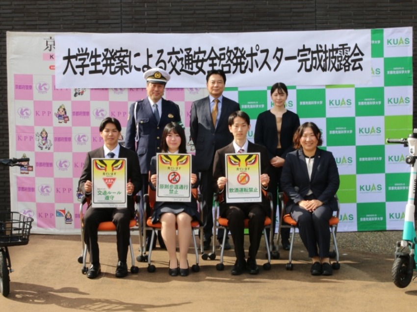 11月4日、京都府警が主催する「ポリス&カレッジ in KYOTO」で本学経済経営学部のプロジェクトチーム(阿部千寿子准教授担当クラス)が最優秀賞を受賞した交通安全ポスターの完成披露会が、本学 太秦キャンパスで執り行われました。