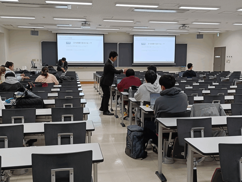 最後に、香料の違いについて、実際に持参いただい香料を用いて、実際に学生に体感させていただきました。ミントなどの異なる香料を組み合わせた調香の実演では、急にコーラの匂いが発せられたことなどに学生も大変驚いた様子でした。このように、食品添加物を効果的に使うことで食事が楽しめていることを学習でき、学生も大変勉強になったようでした。