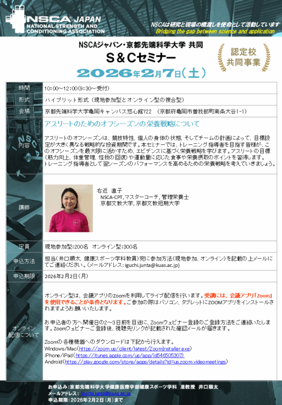 2月7日(土)にNSCAジャパンの講師を本学の京都亀岡キャンパスにお招きし、オフシーズン期の栄養戦略について講義していただきます。