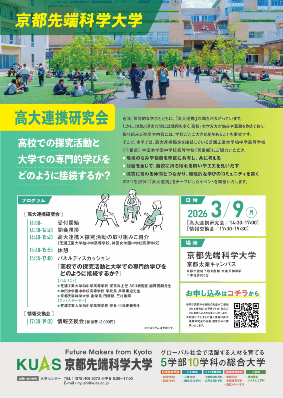 2026年3月9日(月)に高校の先生方を対象に「高大連携研究会 ー高校での探究活動と大学での専門的学びをどのように接続するか?ー」を開催します。