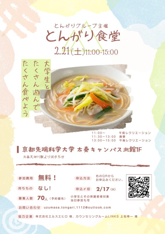 2026.02.05 「とんがり食堂」を開催(2月21日) 年に2回実施している恒例の「とんがり食堂」を2月21日(土)に開催します。温かい食事を囲みながら、子どもたちがほっと安心して過ごせる時間と場所を大切にしています。大学生と一緒に遊ぶ時間もあります。保護者もご一緒にご参加いただくことが可能です。どうぞお気軽にお越しください。 (人文学部心理学科准教授 上松幸一)