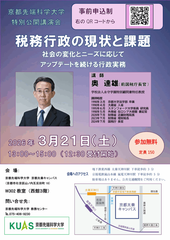 「税理士養成コース」を設置する本学大学院経済学研究科主催の行事として、前国税庁長官であり、昨年11月に本学特別顧問兼特任教授に就任した奥達雄氏を講師に迎え、下記の通り特別公開講演会を開催することになりました。